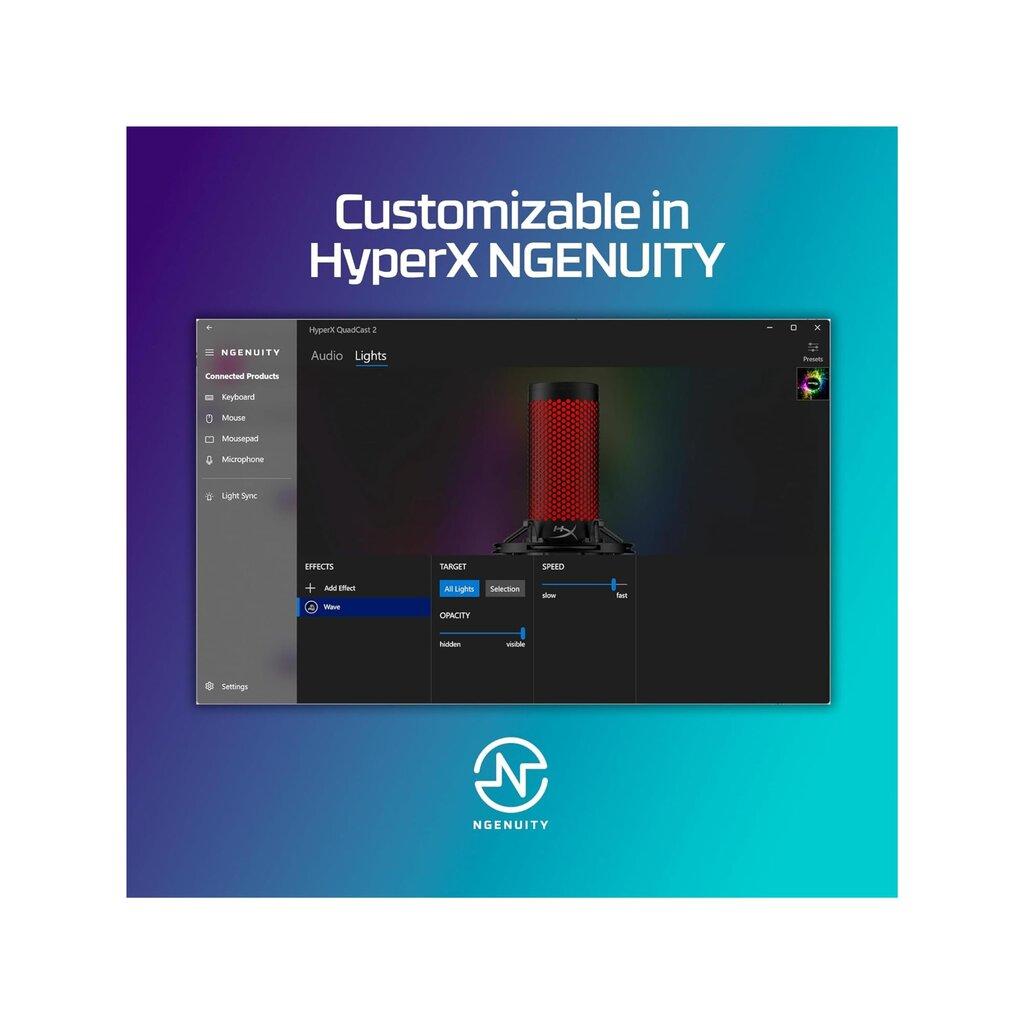 • قابل للتخصيص في HyperX NGENUITY: اضبط المايكروفون الخاص بك، واضبط مراقبة المايك، وخصص إضاءة QuadCast 2 كل ذلك من برنامج HyperX NGENUITY البسيط والقوي.